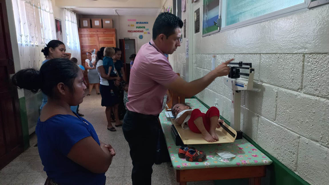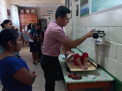 En Champerico, Retalhuleu, el nutricionista David Bámaca, del Componente de Agricultura Sensible a la Nutrición del Ministerio de Agricultura, Ganadería y Alimentación (MAGA), apoyó la jornada de medición de peso y talla de niños menores de cinco años con bajo peso y en recuperación de desnutrición aguda.