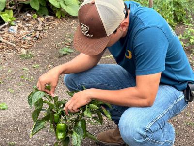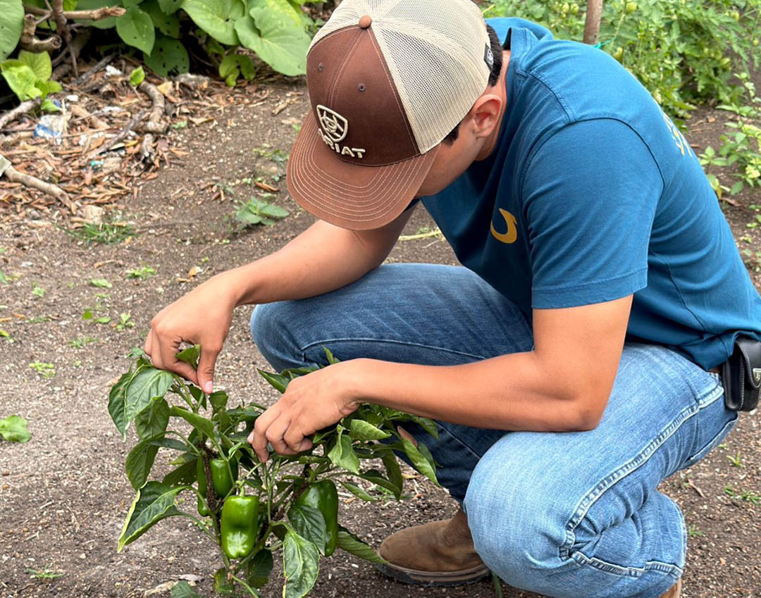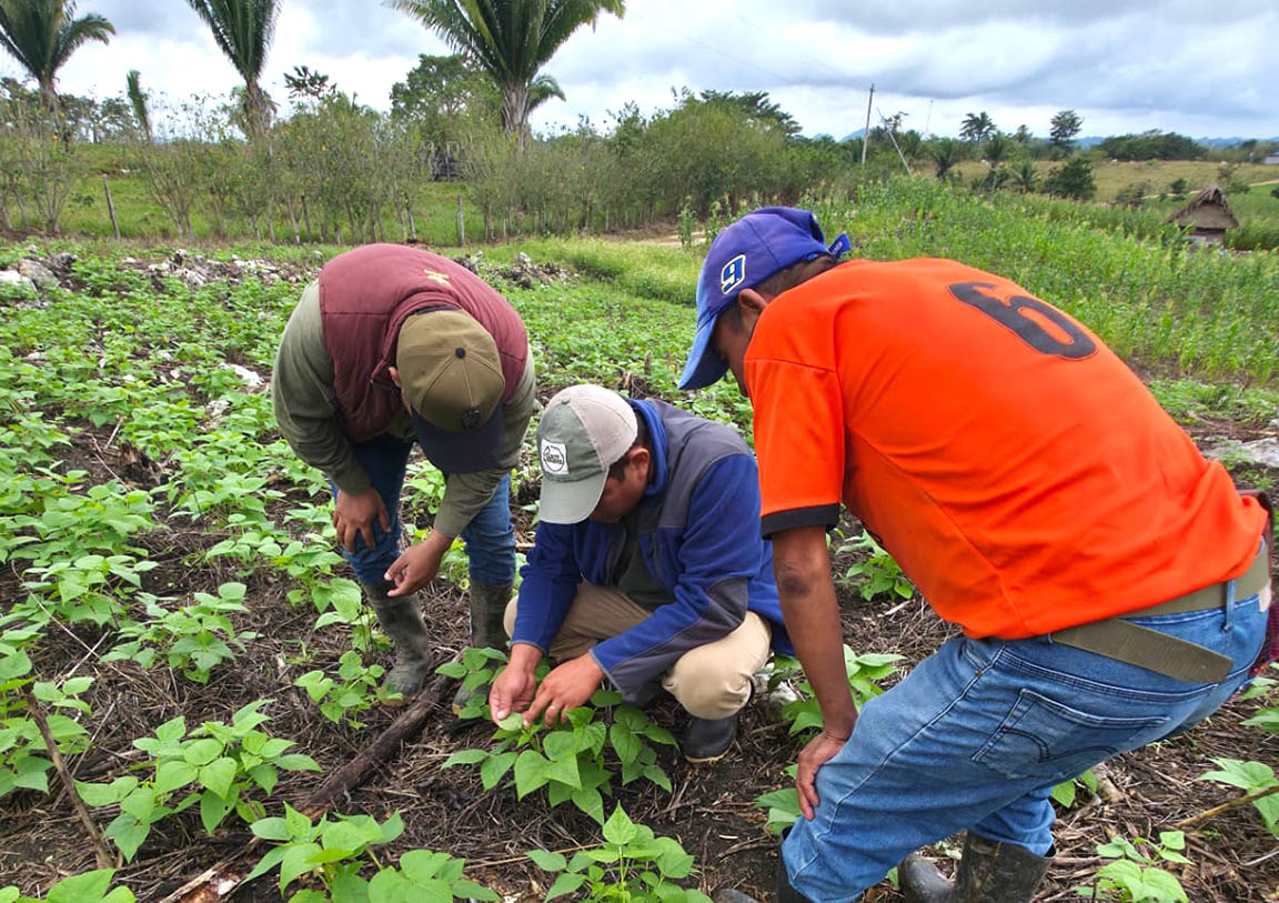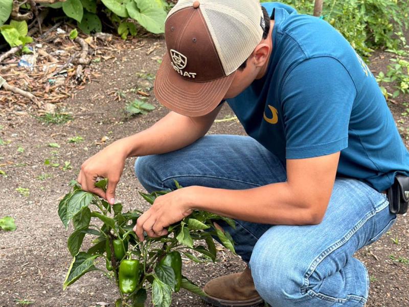 Durante la revisión de huertos familiares en la aldea Agricultores Unidos, municipio de El Chal, Petén, se identificó la presencia de pulgón en algunas plantas, lo que permitió activar la asistencia técnica y orientar a los productores acerca de las medidas de control para proteger cultivos de chile dulce, cilantro y tomate.