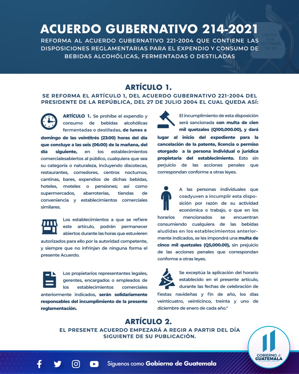 Acuerdo Gubernativo 214-2021 | REFORMA AL ACUERDO GUBERNATIVO 221- 2004 QUE CONTIENE LAS DISPOSICIONES REGLAMENTARIAS PARA EL EXPENDIO Y CONSUMO DE BEBIDAS ALCOHÓLICAS, FERMENTADAS O DESTILADAS