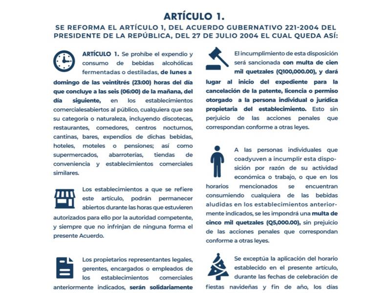 A las personas individuales que coadyuven a incumplir esta disposición por razón de su actividad económica o trabajo, o que en los horarios mencionados se encuentran consumiendo cualquiera de las bebidas aludidas en los establecimientos anteriormente indicados, se les impondrá una multa de cinco mil quetzales (Q5,000.00), sin prejuicio de las acciones penales que correspondan conforme a otras leyes.