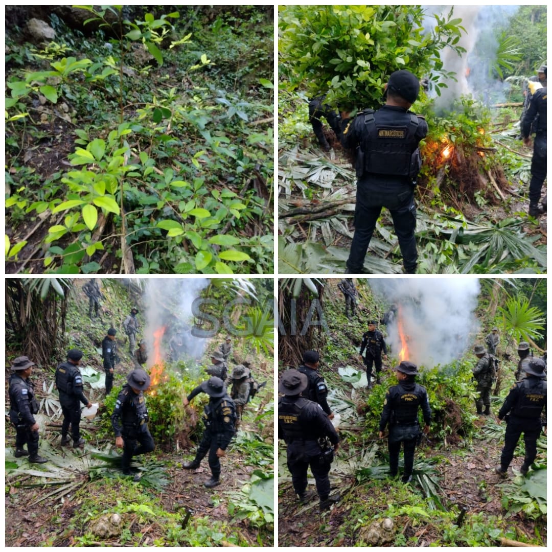 Como parte del trabajo de seguridad y búsqueda, personal antinarcótico de la Subdirección General de Análisis de Información Antinarcótica (SGAIA), de la Policía Nacional Civil (PNC), ubicó en el caserío Mollejón Esquipulas de San Luis, Peten, plantaciones de arbustos de hoja de coca, las cuales fueron erradicadas.