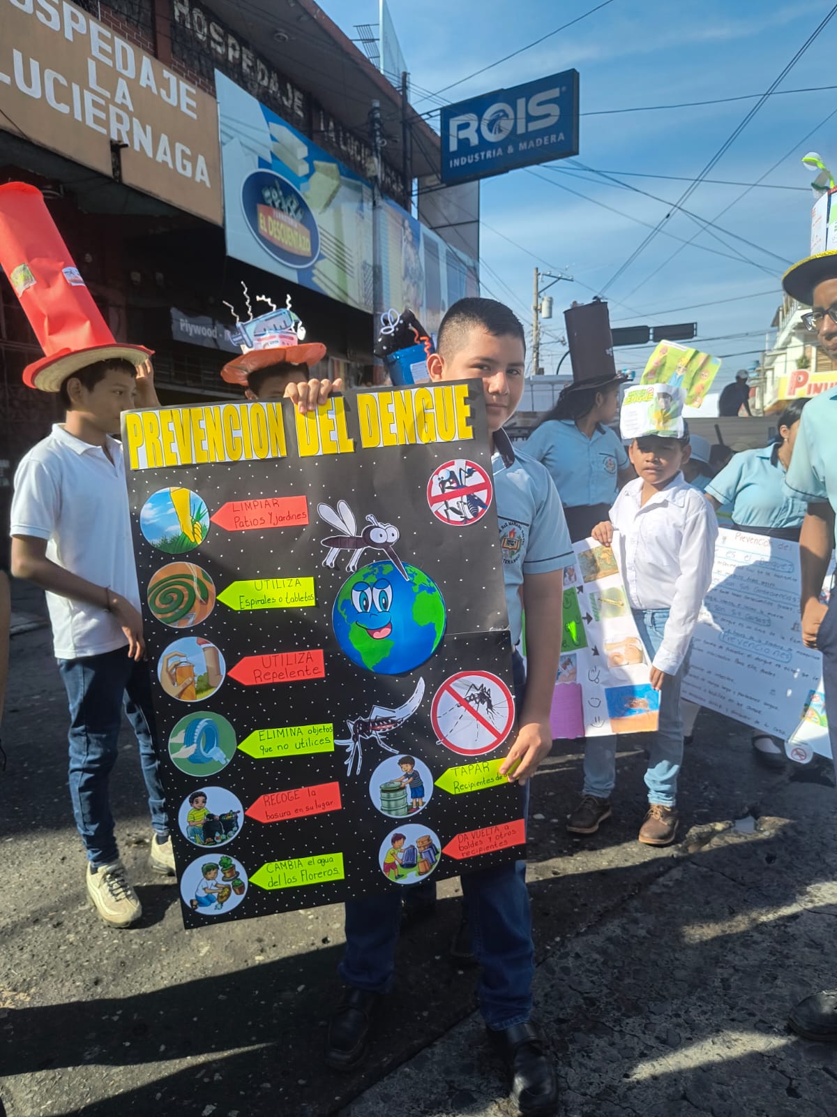 Coloridos disfraces permitieron dar a conocer las medidas de manera creativa, haciendo énfasis en contrarrestar criaderos de zancudos evitando acumulación de chatarra, llantas y objetivos en desuso.
