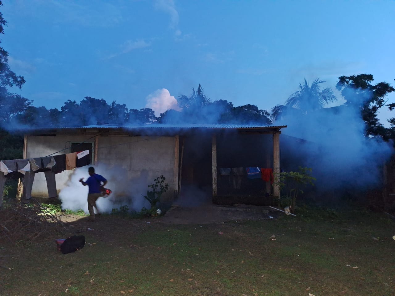 Al caer la tarde empiezan a funcionar los equipos para la fumigación con insecticida para contrarrestar zancudos transmisores y los criaderos.