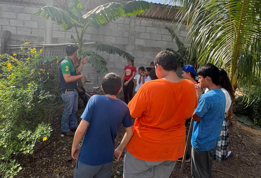Posteriormente, Héctor Salguero, extensionista de Agricultura Familiar, dirigió la implementación de un huerto pedagógico, en el que los estudiantes aprendieron acerca del proceso completo de siembra: limpieza del terreno, elaboración de camellones, riego y plantación. En el huerto fueron sembradas semillas de tomate, chile dulce, chile jalapeño, berenjena y pepino.