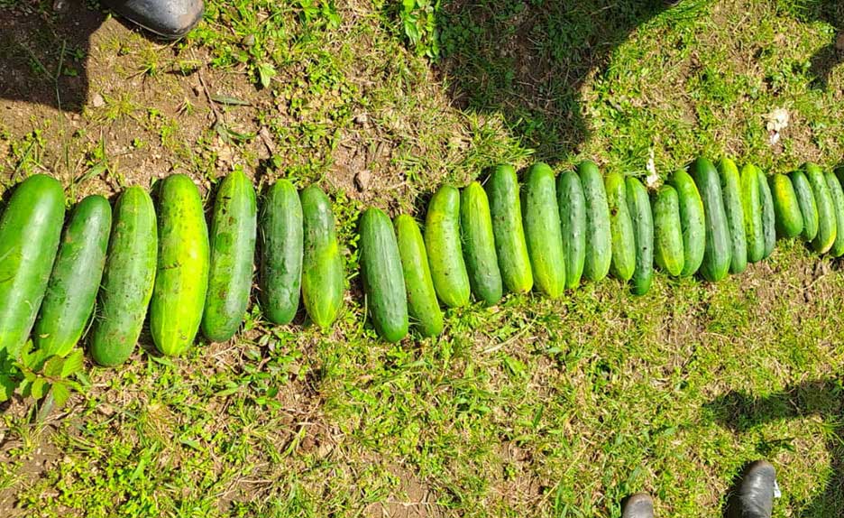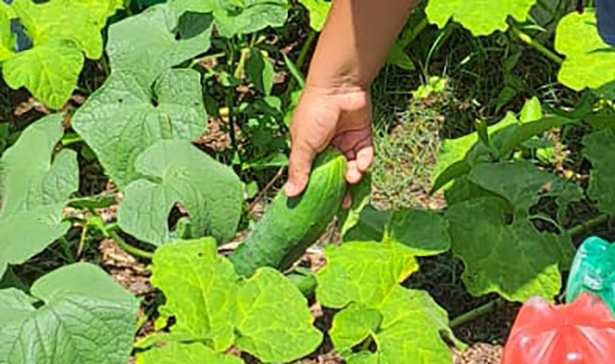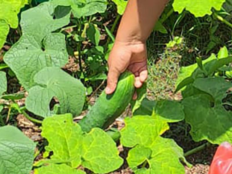 Alumnos recogen su cosecha de pepinos