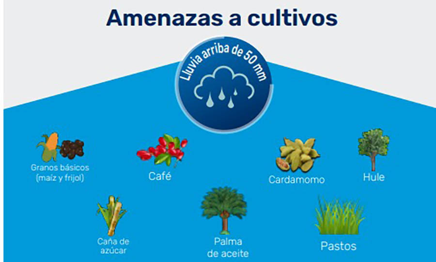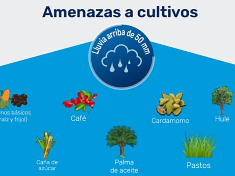 Entre los cultivos que podrían ser afectados por lluvia, se encuentran granos básicos (maíz y frijol), café, cardamomo, caña de azúcar y pastos.