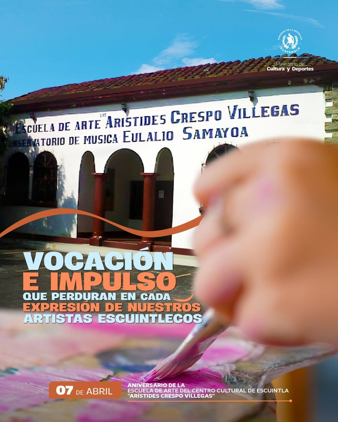 Hoy conmemoramos el aniversario de la Escuela de Arte del Centro Cultural de Escuintla “Arístides Crespo Villegas”, un espacio donde generaciones de artistas han encontrado inspiración para expresar su creatividad, talento y pasión que dan vida al arte en el departamento.
