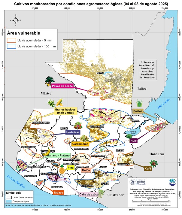 De acuerdo con el análisis agrometorológico del 4 al 8 de agosto de 2025, se prevé una disminución de lluvias y ello implica una baja en la humedad del país. Es por ello que el Ministerio de Agricultura, Ganadería y Alimentación (MAGA), emite sus recomendaciones agropecuarias para ayudar a proteger el patrimonio del pueblo digno.