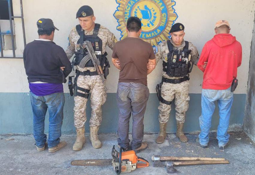 Los detenidos son Esgar Gudiel Rivera Santizo, de 36 años, Maximiliano Ordóñez Santizo, de 66 y Max Estuardo Ordóñez García, de 29 años, quienes con sierras y hachas cortaron un área boscosa de la referida finca.