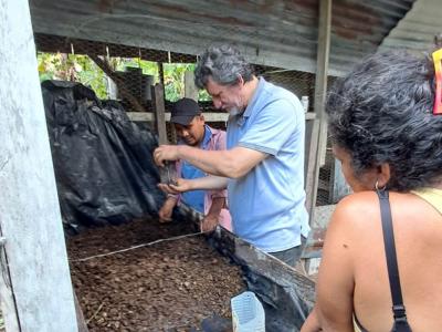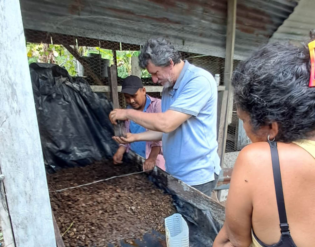 En el caserío El Naranjo, Melchor de Mencos, Petén, el personal de la Agencia Municipal de Extensión Rural (AMER), del Ministerio de Agricultura, Ganadería y Alimentación (MAGA), capacitó a una familia en la elaboración en la elaboración de una lombricompostera utilizando lombriz coqueta roja (Eisenia foetida), con el objetivo de producir humus y lombricomposta para mejorar la fertilidad del suelo de los huertos familiares.