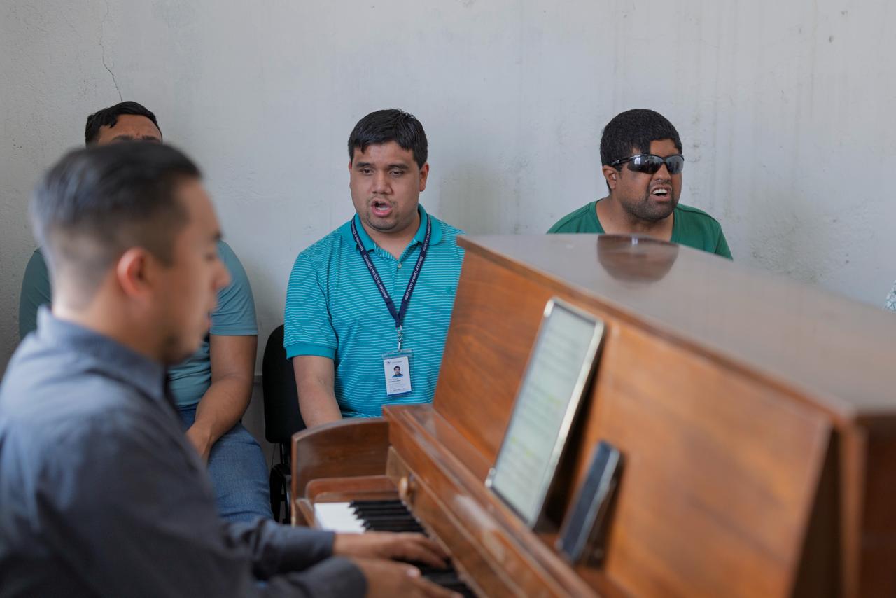 Una vez estudiada cada pieza, el coro se divide en grupos para ensayar. Los hombres trabajan junto al maestro Joshua Texaj, pianista de la agrupación; las mujeres ensayan con el director, y las intérpretes de lengua de señas practican por separado con el apoyo de una especialista, quien las guía en su participación.