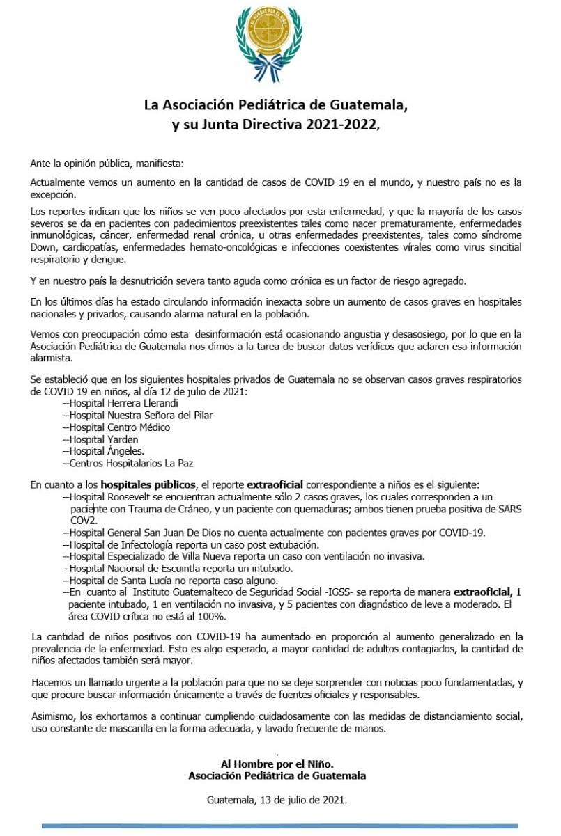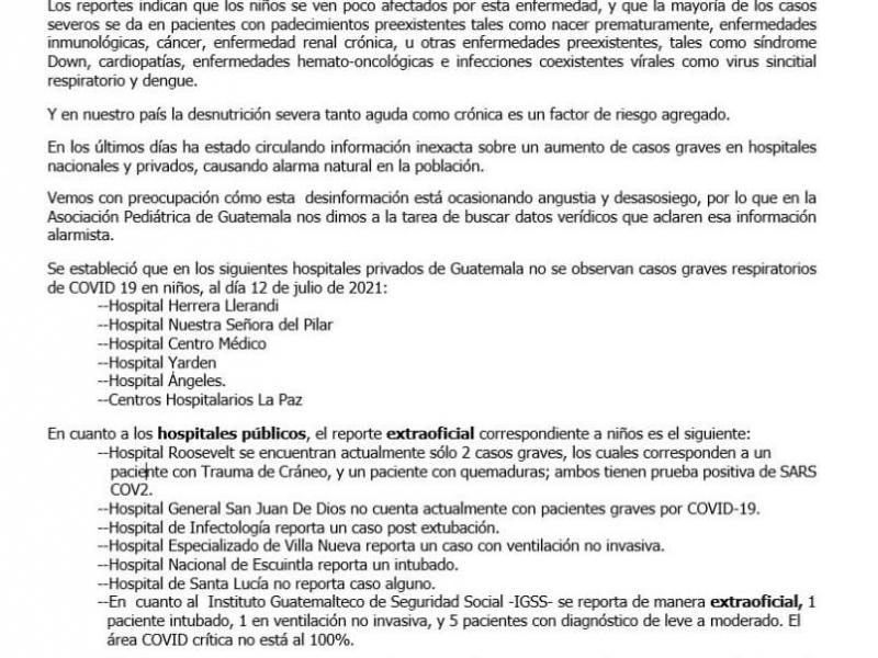 La Asociación Pediátrica de Guatemala advierte sobre este tipo de publicaciones en un comunicado en el que textualmente dice: “En los últimos días ha estado circulando información inexacta sobre un aumento de casos graves en hospitales nacionales y privados, causando alarma natural en la población”. Y agrega que: “Vemos con preocupación cómo esta desinformación está ocasionando angustia y desasosiego, por lo que en la Asociación Pediátrica de Guatemala nos dimos a la tarea de buscar datos verídicos que aclaren esa información alarmista”.