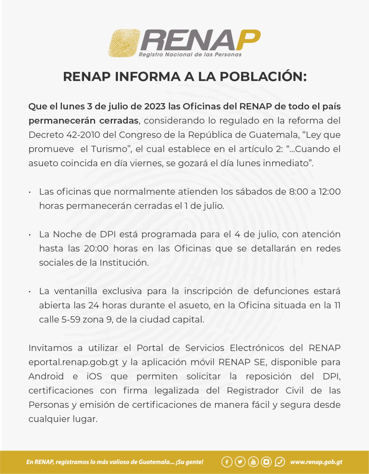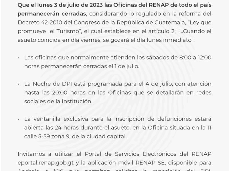 Que el lunes 3 de julio de 2023 las Oficinas del RENAP de todo el país permanecerán cerradas, considerando lo regulado en la reforma del Decreto 42-2010 del Congreso de la República de Guatemala, “Ley que promueve el Turismo”, el cual establece en el artículo 2: “…Cuando el asueto coincida en día viernes, se gozará el día lunes inmediato”.