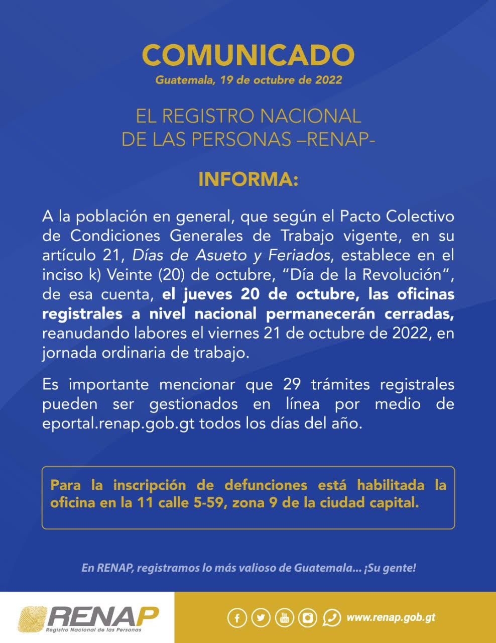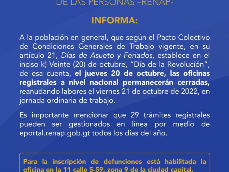 A la población en general, que según el Pacto Colectivo de Condiciones Generales de Trabajo vigente, en su artículo 21, Días de Asueto y Feriados, establece en el inciso k) Veinte (20) de octubre, “Día de la Revolución”, de esa cuenta, el jueves 20 de octubre, las oficinas registrales a nivel nacional permanecerán cerradas, reanudando labores el viernes 21 de octubre de 2022, en jornada ordinaria de trabajo.