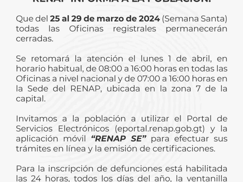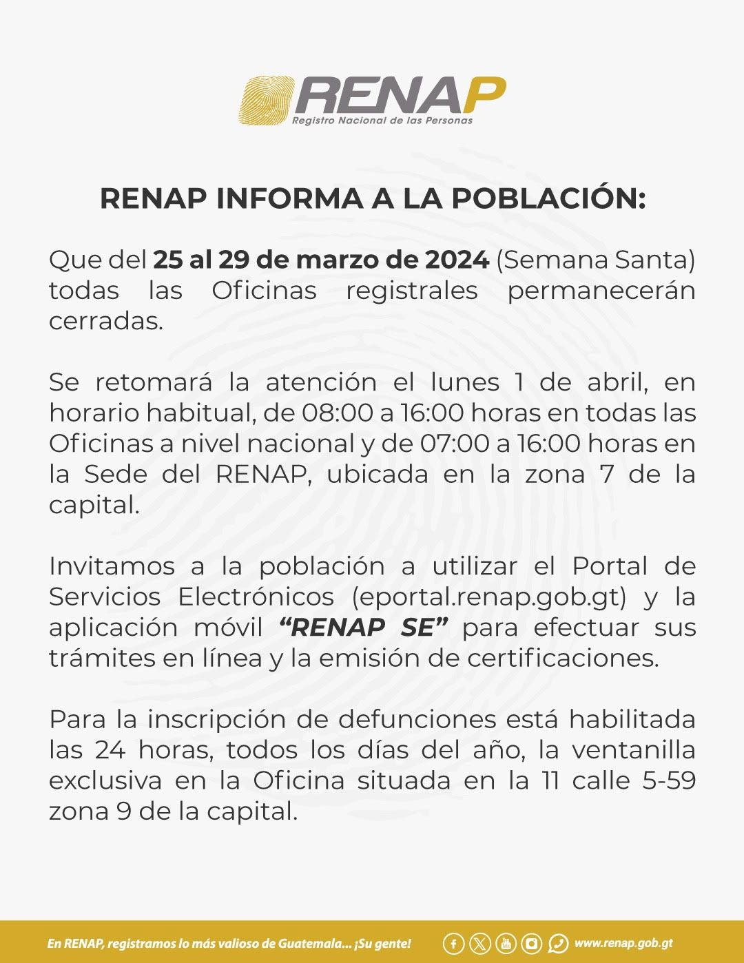 Que del 25 al 29 de marzo de 2024 (Semana Santa) todas las Oficinas registrales permanecerán cerradas. Se retomará la atención el lunes 1 de abril, en horario habitual, de 08:00 a 16:00 horas en todas las Oficinas a nivel nacional y de 07:00 a 16:00 horas en la Sede del RENAP, ubicada en la zona 7 de la capital. Invitamos a la población a utilizar el Portal de Servicios Electrónicos (eportal.renap.gob.gt) y la aplicación móvil "RENAP SE" para efectuar sus trámites en línea y la emisión de certificaciones. Para la inscripción de defunciones está habilitada las 24 horas, todos los días del año, la ventanilla exclusiva en la Oficina situada en la 11 calle 5-59 zona 9 de la capital.