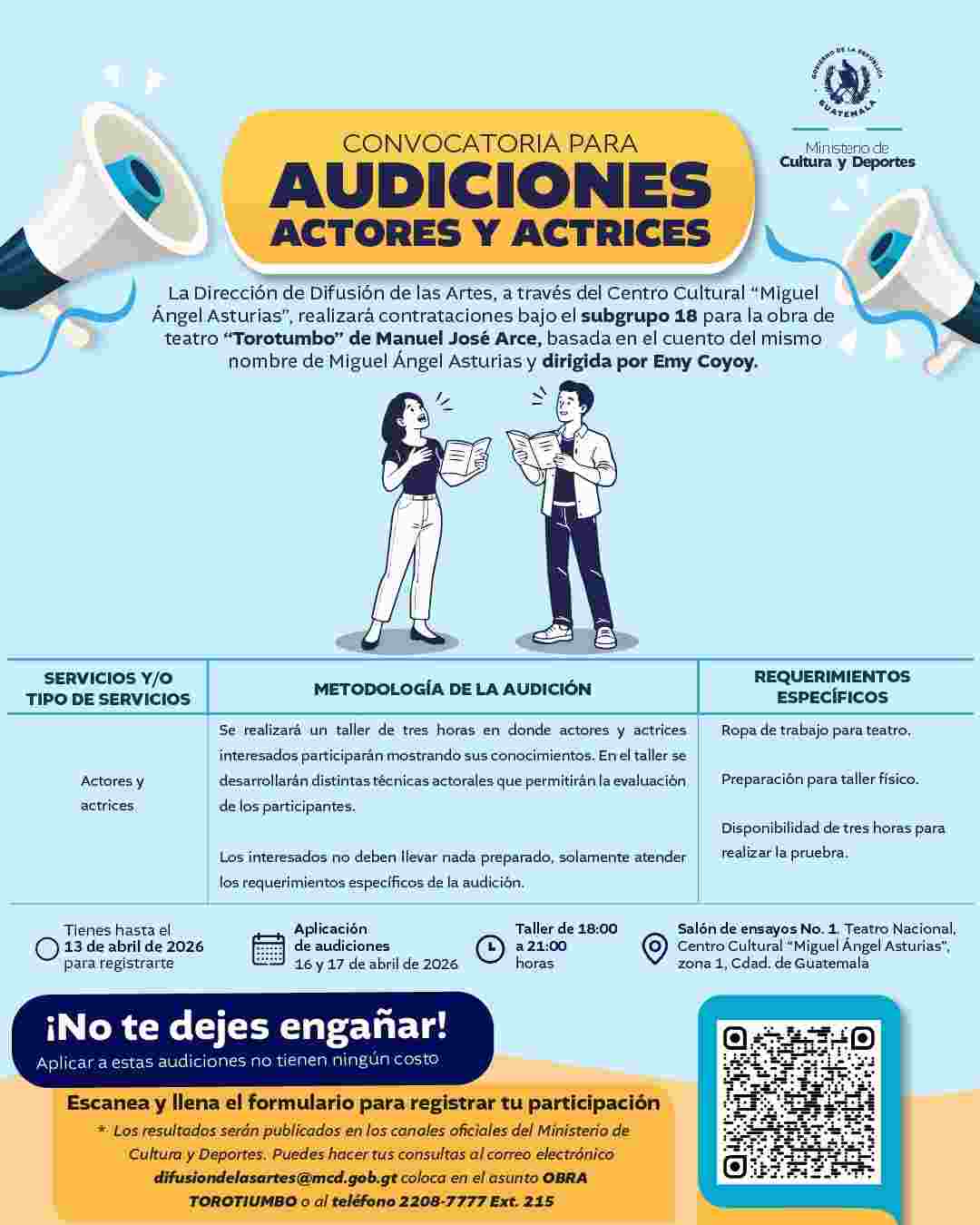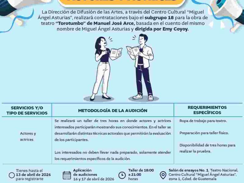 Regístrate y audiciona, podrías formar parte del elenco que con su talento den vida a la obra «Torotumbo», de Manuel José Arce, basada en el cuento de Miguel Ángel Asturias.