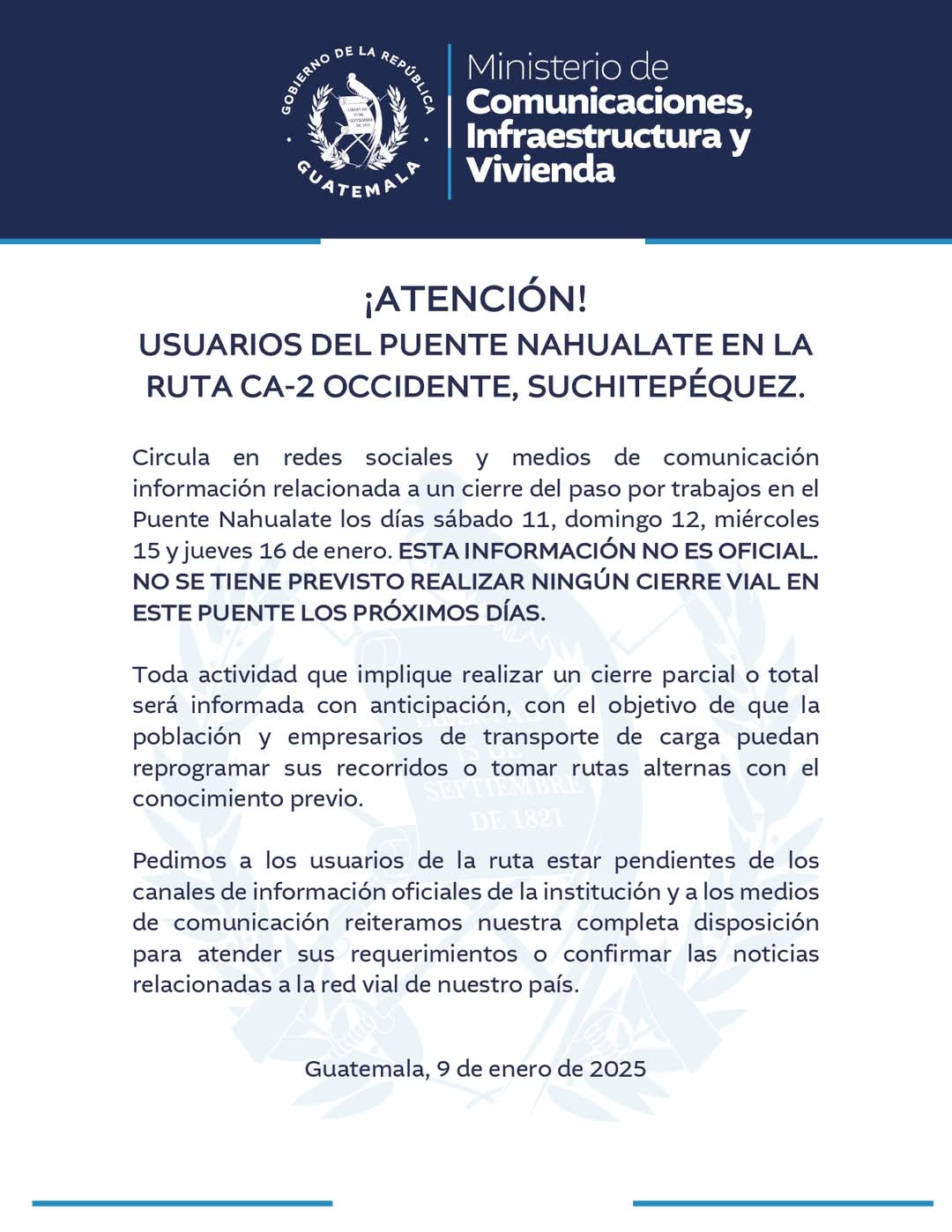 Circula en redes sociales y medios de comunicación información relacionada a un cierre del paso por trabajos en el Puente Nahualate los días sábado 11, domingo 12, miércoles 15 y jueves 16 de enero. ESTA INFORMACIÓN NO ES OFICIAL. NO SE TIENE PREVISTO REALIZAR NINGÚN CIERRE VIAL EN ESTE PUENTE LOS PRÓXIMOS DÍAS.