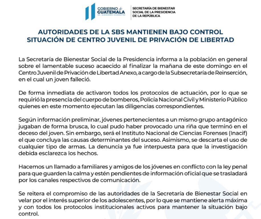 La Secretaría de Bienestar Social de la Presidencia informa a la población en general sobre el lamentable suceso acaecido al finalizar la mañana de este domingo en el Centro Juvenil de Privación de Libertad Anexo, a cargo de la Subsecretaría de Reinserción, en el cual un joven falleció.