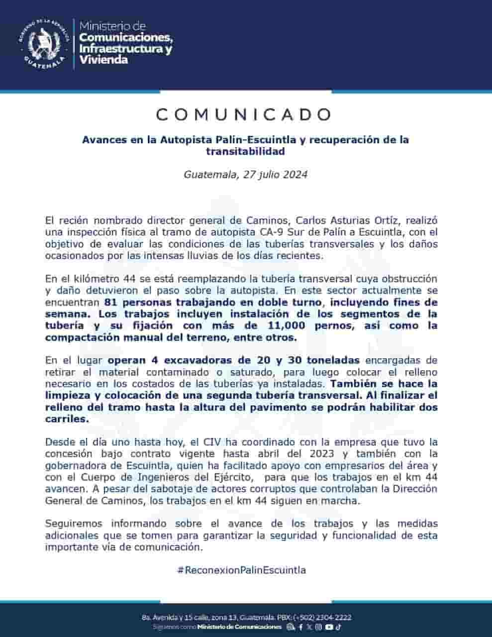 Desde el día uno hasta hoy, el CIV ha coordinado con la empresa que tuvo la concesión bajo contrato vigente hasta abril del 2023 y también con la gobernadora de Escuintla, quien ha facilitado apoyo con empresarios del área y con el Cuerpo de Ingenieros del Ejército, para que los trabajos en el km 44 avancen. A pesar del sabotaje de actores corruptos que controlaban la Dirección General de Caminos, los trabajos en el km 44 siguen en marcha.