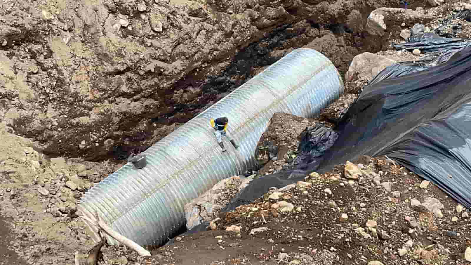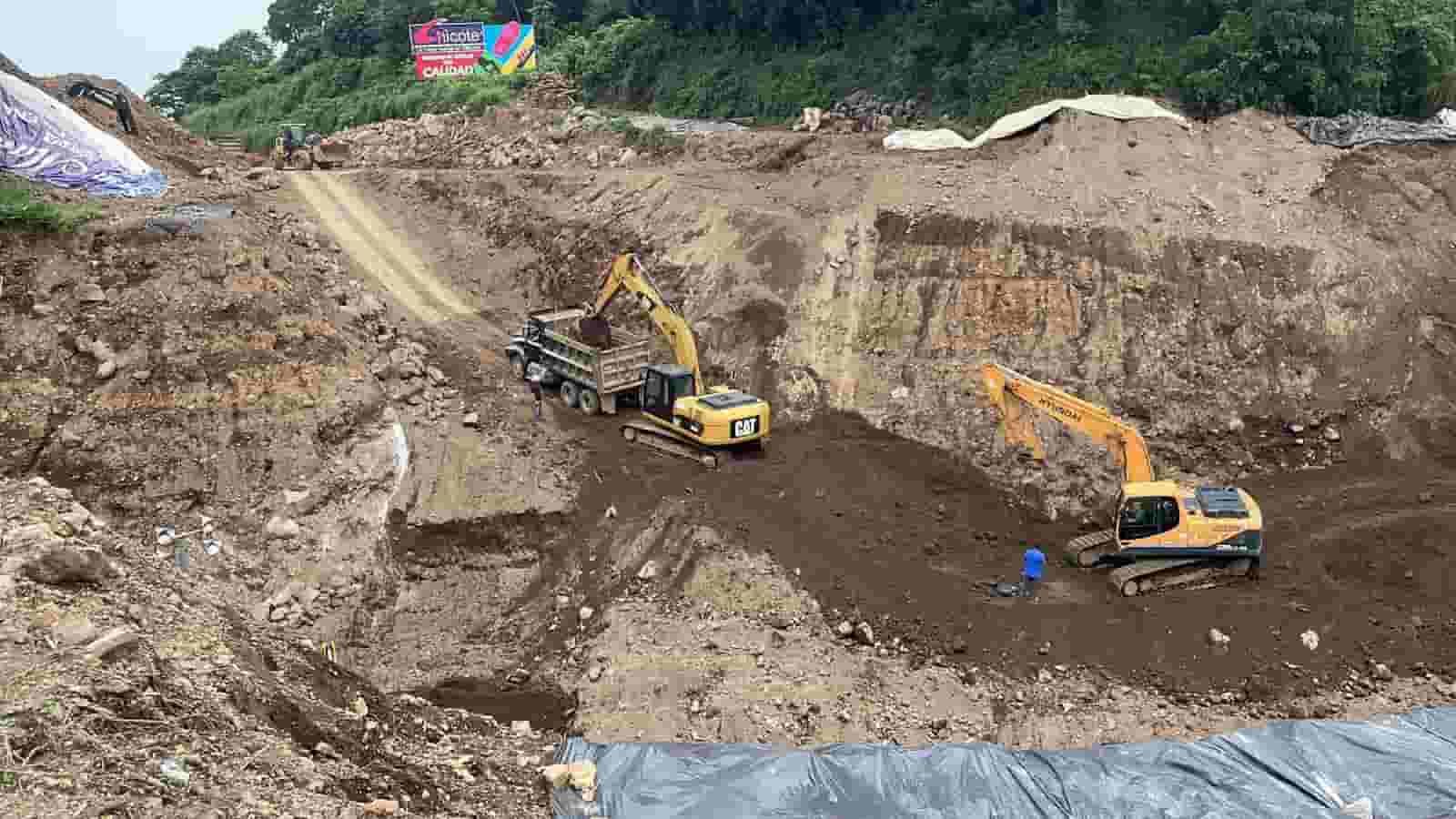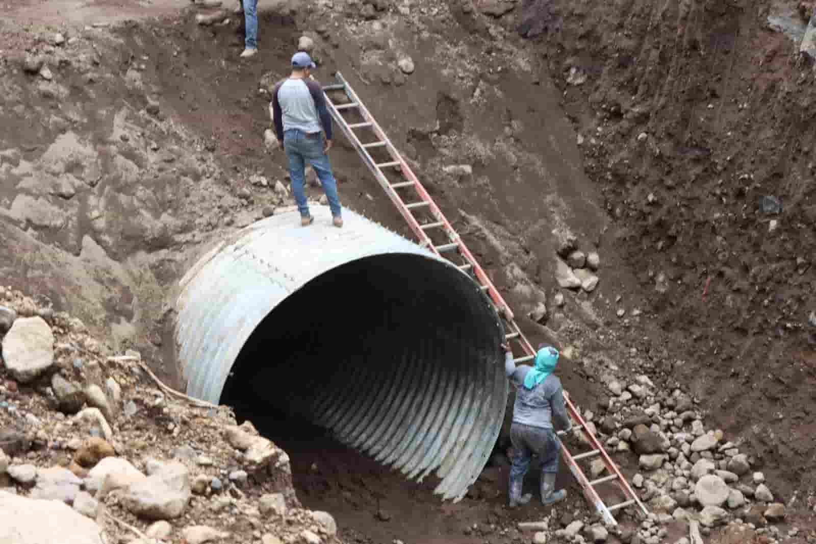 En el lugar operan 4 excavadoras de 20 y 30 toneladas encargadas de retirar el material contaminado o saturado, para luego colocar el relleno necesario en los costados de las tuberías ya instaladas. También se hace la limpieza y colocación de una segunda tubería transversal. Al finalizar el relleno del tramo hasta la altura del pavimento se podrán habilitar dos carriles.