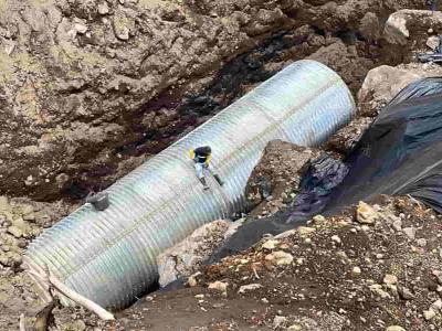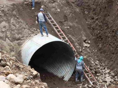 En el kilómetro 44 se está reemplazando la tubería transversal cuya obstrucción y daño detuvieron el paso sobre la autopista. En este sector actualmente se encuentran 81 personas trabajando en doble turno, incluyendo fines de semana. Los trabajos incluyen instalación de los segmentos de la tubería y su fijación con más de 11,000 pernos, así como la compactación manual del terreno, entre otros.