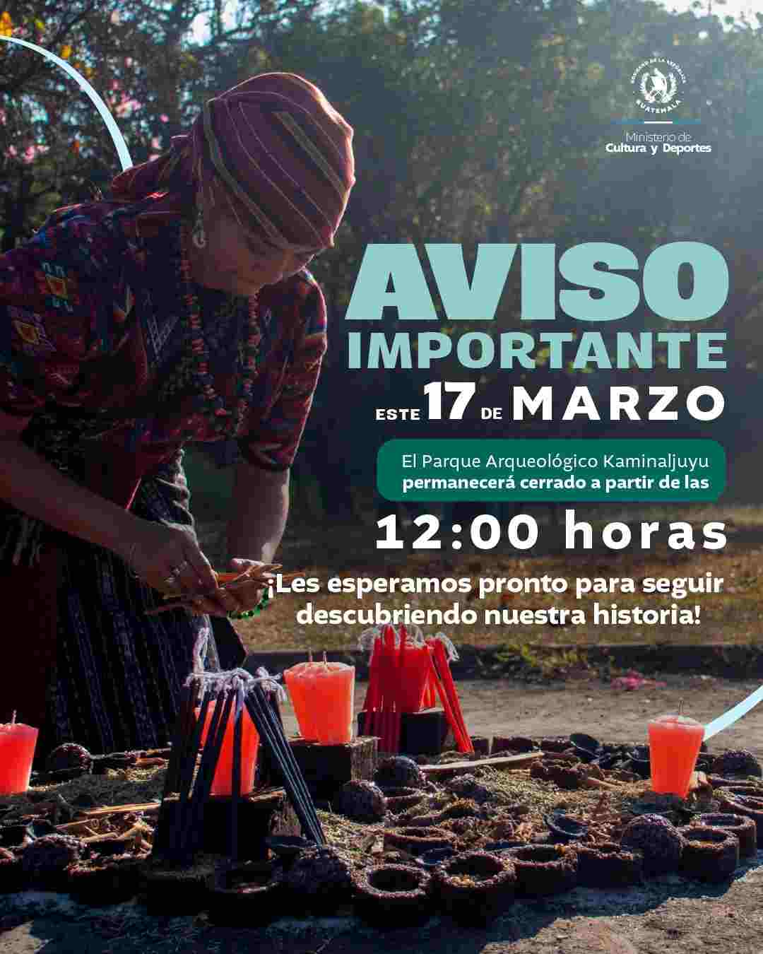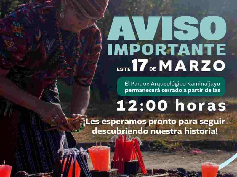 Informamos que el Parque Arqueológico Kaminaljuyu permanecerá cerrado al público este 17 de marzo a partir de las 12:00 horas.
