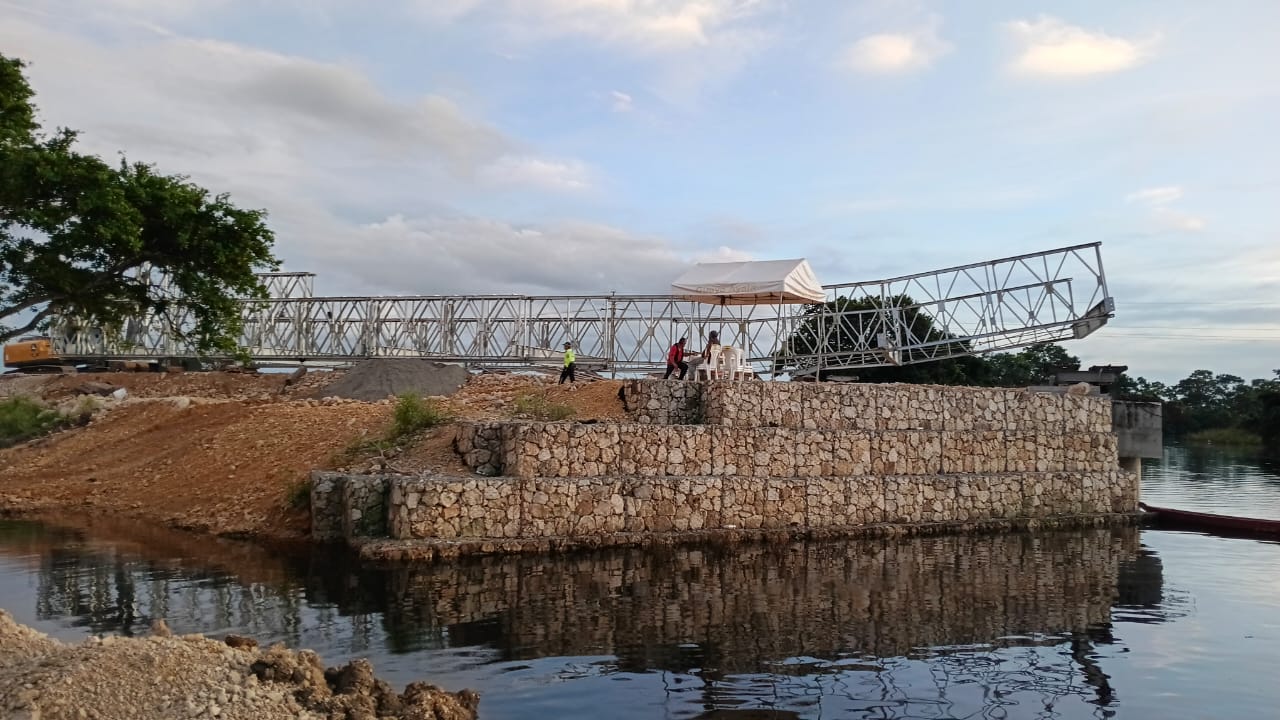 Bajo altas temperaturas y en medio del clima característico de la región norte de Petén, personal de la Sección de Puentes y Vigas de la Dirección General de Caminos continúa con los trabajos de construcción del puente modular tipo Bailey sobre el arroyo Petexbatún, en el municipio de Sayaxché.