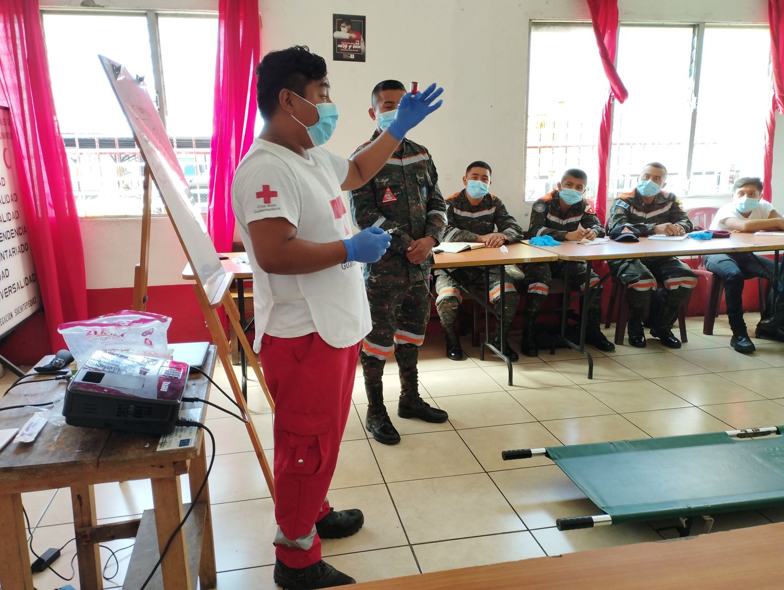 Como parte de estas actividades de entrenamiento, los rescatistas de la Compañía de Asistencia Humanitaria y de Rescate del Batallón de Ayuda Humanitaria y de Rescate, desplegados en la Cuarta Brigada de Infantería “General Justo Rufino Barrios”, con sede en el departamento de Suchitepéquez, participaron en la capacitación de “Primeros auxilios y canalización”, que fue impartida en coordinación con la Cruz Roja Guatemalteca.