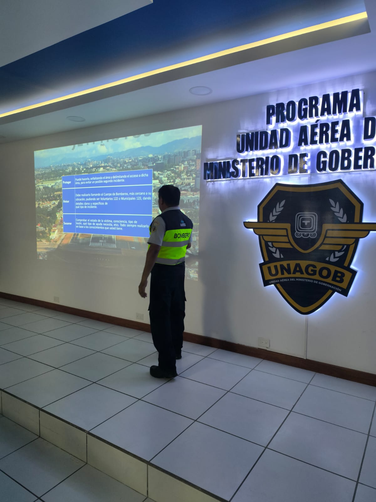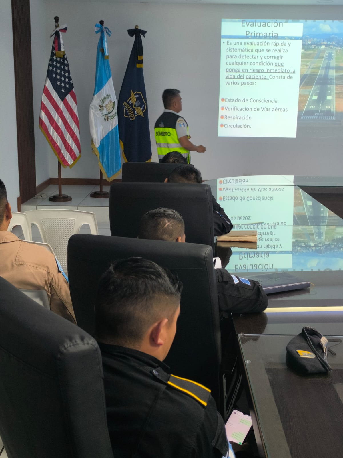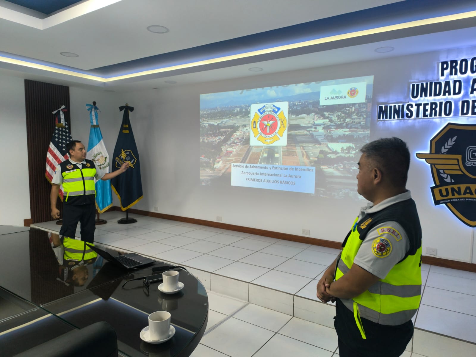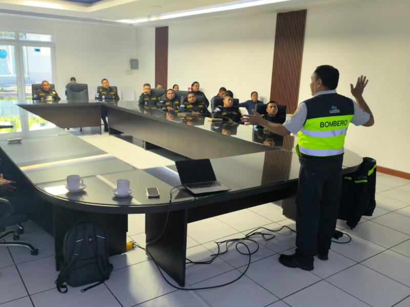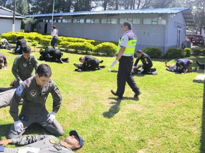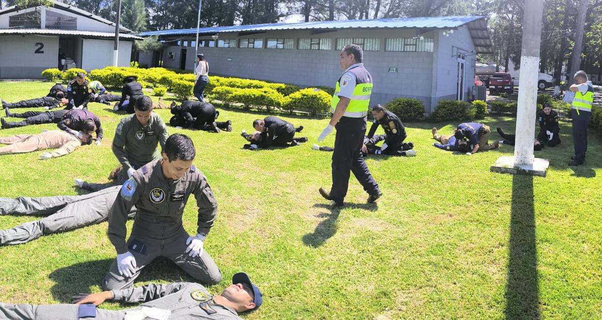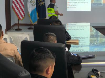 Los bomberos Ildolfor Pérez Orozco y Rogelio Toxcon, pertenecientes al Servicio de Salvamento y Extinción de Incendios (SSEI) de la Dirección General de Aeronáutica Civil (DGAC), impartieron una importante capacitación en primeros auxilios dirigida a personal de distintas instituciones de seguridad y rescate.