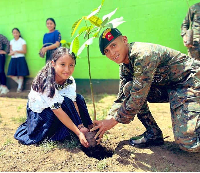 En el marco de estas acciones, la Brigada de Infantería de Marina del Ejército de Guatemala, en coordinación con docentes y alumnos de la Escuela Oficial San Jorge, El Estor, Izabal, sembraron 150 árboles de diferentes especies en el área cercana a dicho establecimiento educativo, con el fin de mejorar el entorno escolar y promover la conciencia ambiental en los participantes.