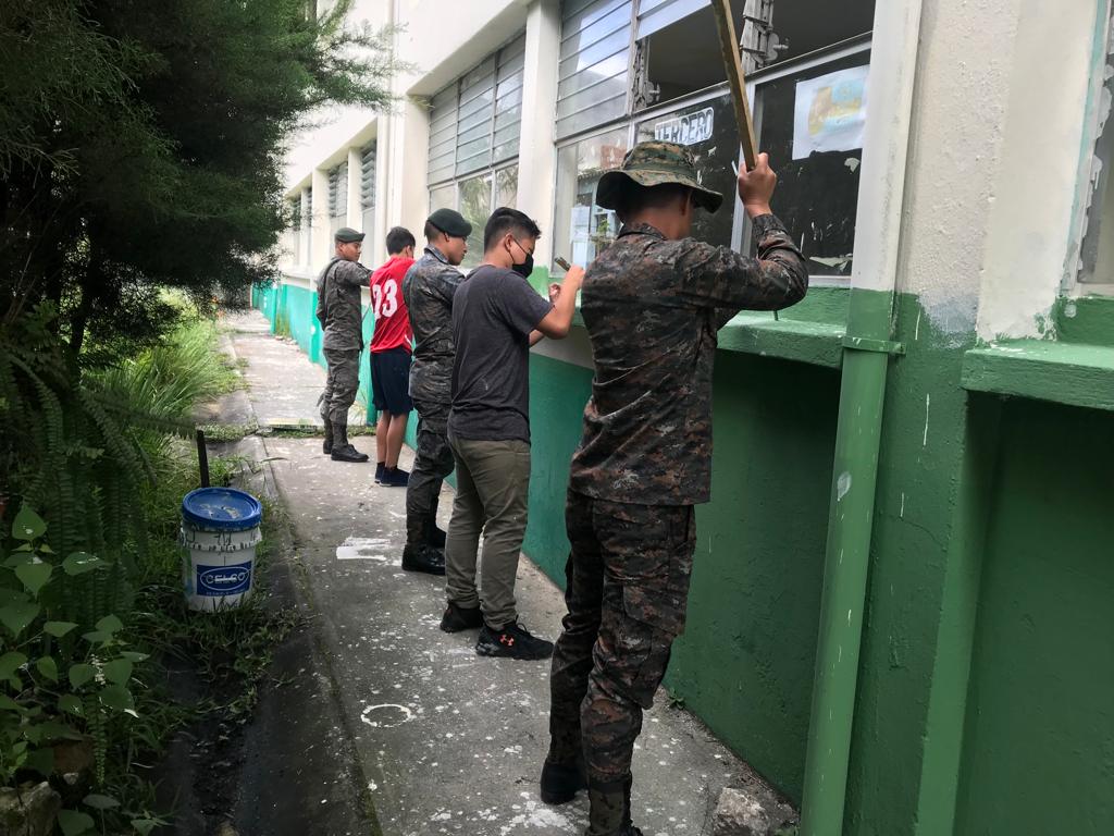 Como parte de estas acciones, soldados de la Brigada Militar "Mariscal Zavala", efectuan el remozamiento del Instituto Nacional Mixto de Educación Básica INEB, ubicado en la colonia Atlántida en la zona 17 de la ciudad capital, donde el personal militar, trabaja en conjunto con padres de familia y alumnos, para realizar labores de limpieza y aplicación de pintura a los muros interiores y exteriores de dicho establecimiento.