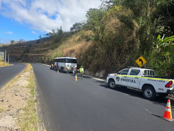 Brigadas de la Dirección General de Protección y Seguridad Vial (Provial) asisten a bus varado por fallas mecánicas en el km 45.9 de ruta a El Salvador [CA-1 Oriente] en jurisdicción de El Cerinal, Barberena, lo que obstruye el paso en el carril derecho hacia occidente.
