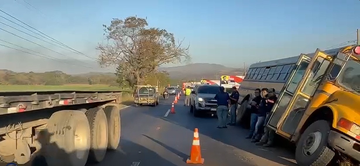 Brigadas de la Dirección General de Protección y Seguridad Vial (Provial) brinda asistencia en hecho de tránsito en el km 66 de la ruta CA-2 Occidente, en jurisdicción de Escuintla donde un bus urbano se salió de la pista, lo que mantuvo obstruido el carril izquierdo con dirección al oriente.