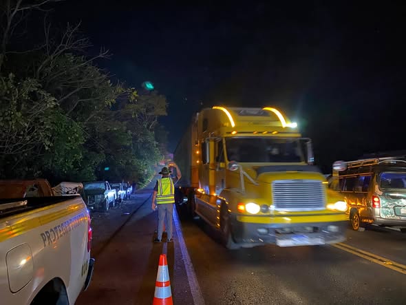 Brigadas de la Dirección General de Protección y Seguridad Vial (Provial) atienden hecho de tránsito en el km 150 de la ruta CA-2 Occidente, en San Antonio, Suchitepéquez, donde se produjo una colisión entre dos vehículos de transporte pesado lo que mantuvo obstruido el carril hacia occidente.