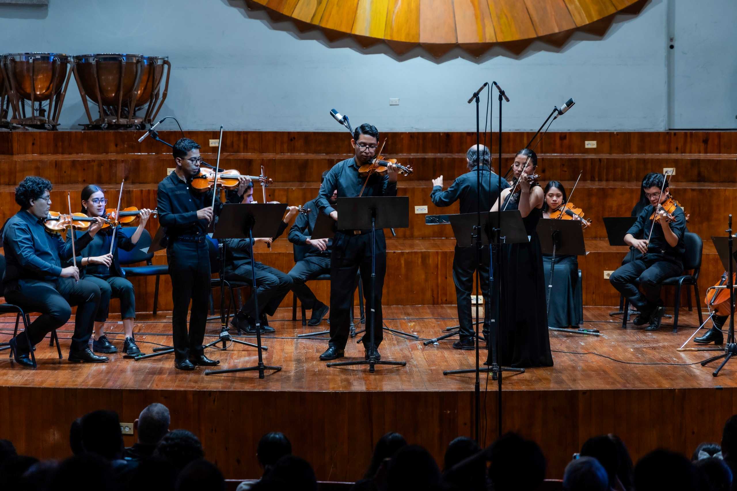 La noche siguió, llena de magia solista, con el Concierto para 3 violines en Re Mayor del inmortal Johann Sebastian Bach. En esta pieza intervinieron como solistas Ever Alexander Alfaro en el violín 1, Marvin Eduardo Coxaj en el violín 2 y Katerin Mishell Toj en el violín 3.