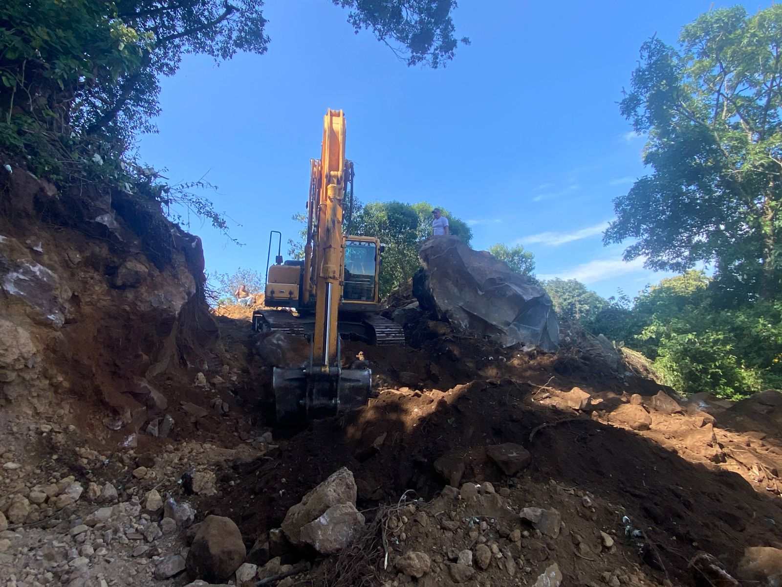 Entre rocas, tierra y vegetación espesa, el personal de la Zona Vial 12 de la Dirección General de Caminos (DGC) continúa abriendo paso en la nueva ruta alterna que comunicará a los vecinos de Santa María de Jesús y San Juan del Obispo, en Sacatepéquez.