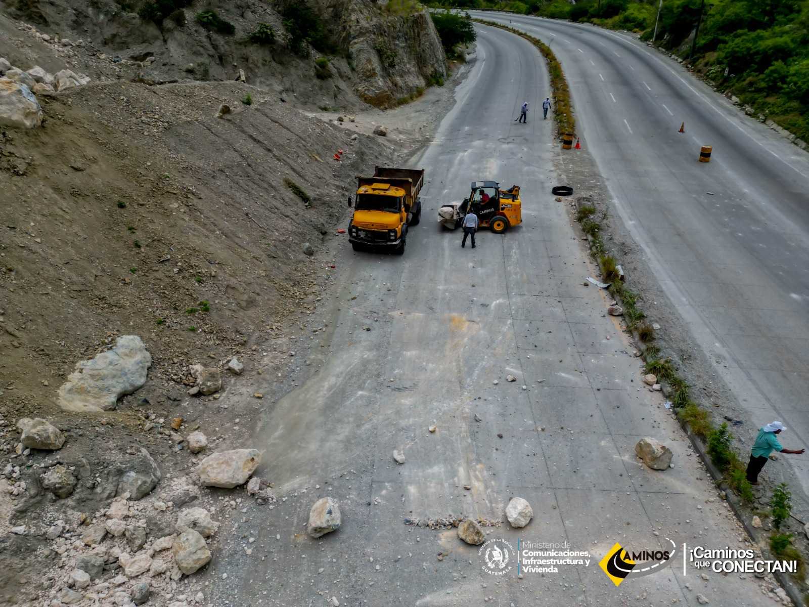Más de 20 metros cúbicos de rocas y tierra fueron removidos por personal de la Zona Vial 1 y el Distrito No. 10 de la Dirección General de Caminos, tras un desprendimiento registrado en el km 66 de la ruta CA-09 Norte, en el sentido sur-norte.