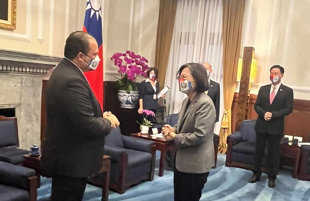Taipéi, República de China (Taiwán), 30 de agosto de 2022. Como parte de su visita oficial a la República de China (Taiwán), el canciller Mario Búcaro se reunió este martes en Taipéi con la presidenta de ese país, S. E. Tsai Ing-wen, para abordar asuntos de interés bilateral y multilateral.