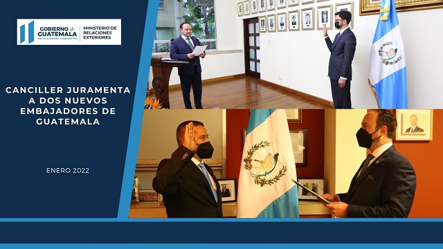 Guatemala, 6 de enero de 2022. El canciller Pedro Brolo Vila juramentó este jueves por la tarde a dos nuevos embajadores quienes representarán a nuestro país a nivel internacional como parte de la reestructuración constante del Ministerio de Relaciones Exteriores (Minex) y su proceso de modernización.