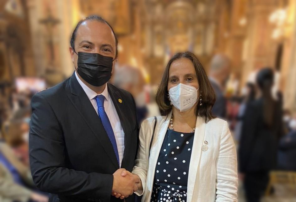 Santiago de Chile, 12 de marzo de 2022. En el marco del Encuentro Ecuménico por Chile y el nuevo Gobierno que se ofició en la Catedral Metropolitana en Santiago, el ministro de Relaciones Exteriores de Guatemala, Mario Búcaro, sostuvo una cordial conversación con su homóloga chilena, Antonia Urrejola, ocasión en la que expresó una sincera felicitación en nombre del presidente de la República de Guatemala, Alejandro Giammattei, por su reciente nombramiento en el cargo y auguró los mejores deseos por el éxito de su gestión.