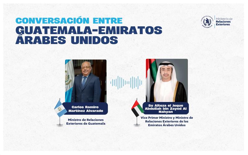 Guatemala, 12 de marzo de 2026. El Viceministro de Relaciones Exteriores de Guatemala, Carlos Ramiro Martínez Alvarado, y el Viceprimer Ministro y Ministro de Asuntos Exteriores de los Emiratos Árabes Unidos, Abdullah Bin Zayed Al Nahyan, sostuvieron una conversación telefónica en la que se expresó la gran preocupación del Gobierno de Guatemala por la situación que atraviesa el Medio Oriente. Asimismo, se reiteró el más firme rechazo por los ataques bélicos dirigidos contra un país amigo, aliado y socio estratégico.