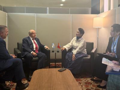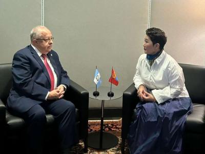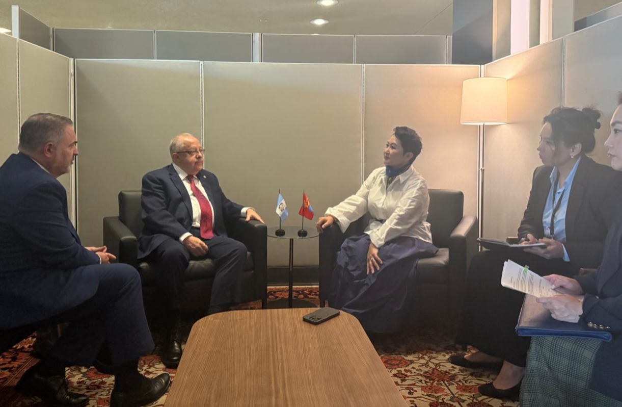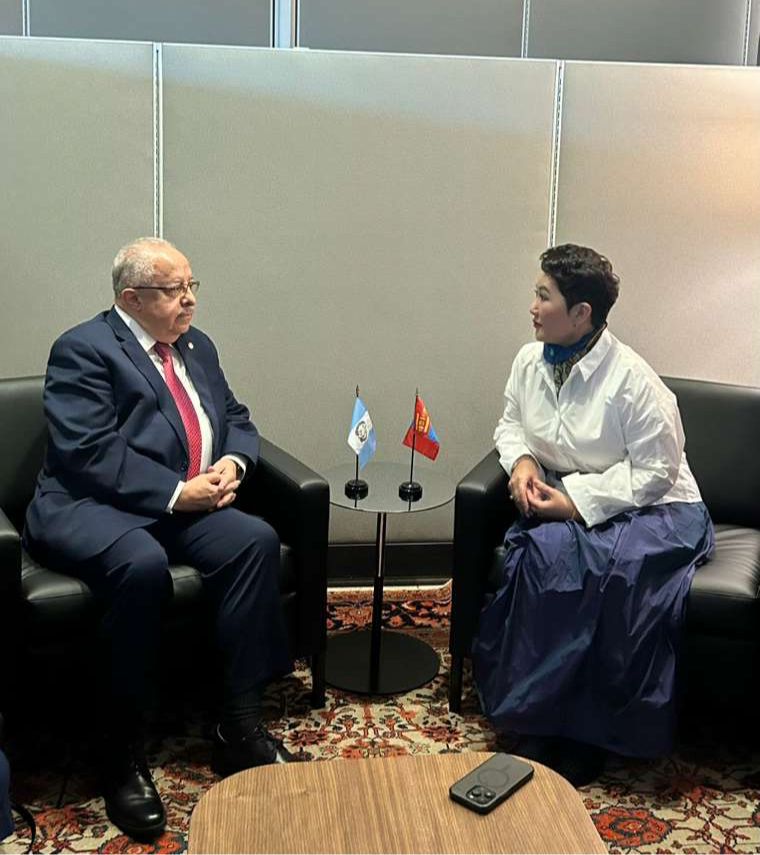 Nueva York, EE. UU., 26 de septiembre de 2025. El Ministro de Relaciones Exteriores, Carlos Ramiro Martínez Alvarado, sostuvo una reunión bilateral con su homóloga de Mongolia, Battsetseg Batmunkh, la cual se desarrolló al margen del 80 periodo de sesiones de la Asamblea General de la ONU.