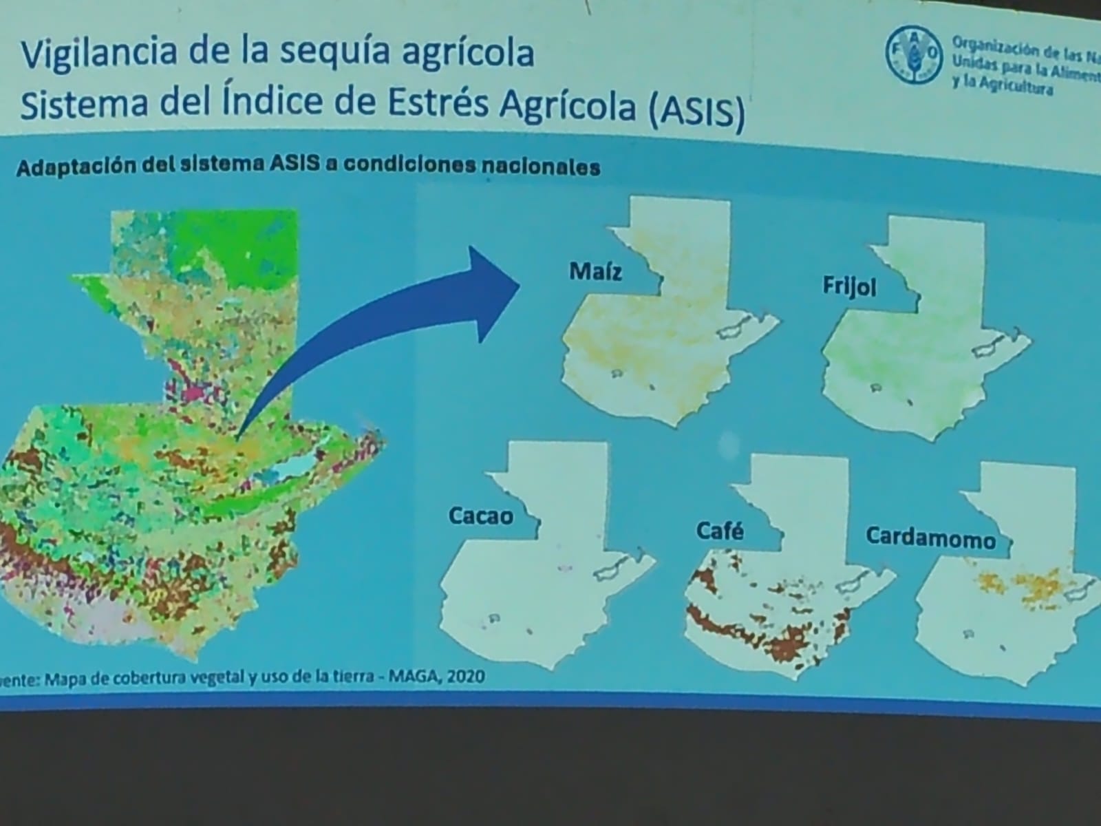 Se desarrolló un taller en el Centro de Capacitación El Tule, ubicado en el municipio de Chiquimula, con el propósito de fortalecer las capacidades de los extensionistas del Ministerio de Agricultura, Ganadería y Alimentación (MAGA), en el uso del Sistema del Índice de Estrés Agrícola (ASIS, por sus siglas en inglés), el cual fue desarrollado por la Organización de las Naciones Unidas para la Alimentación y la Agricultura (FAO).