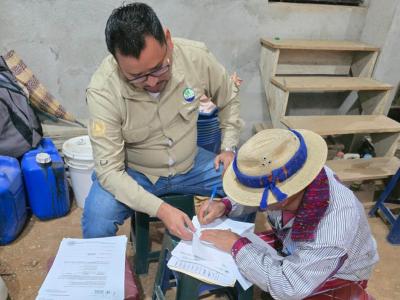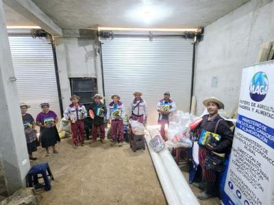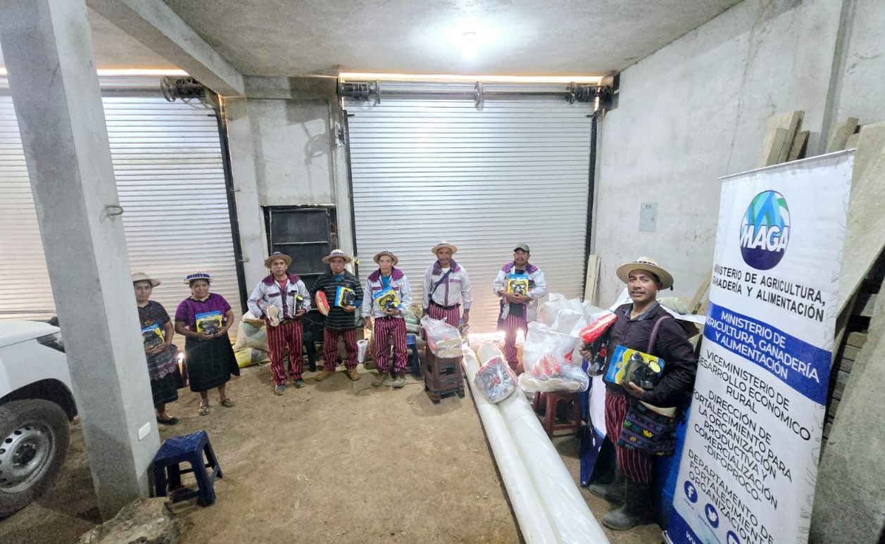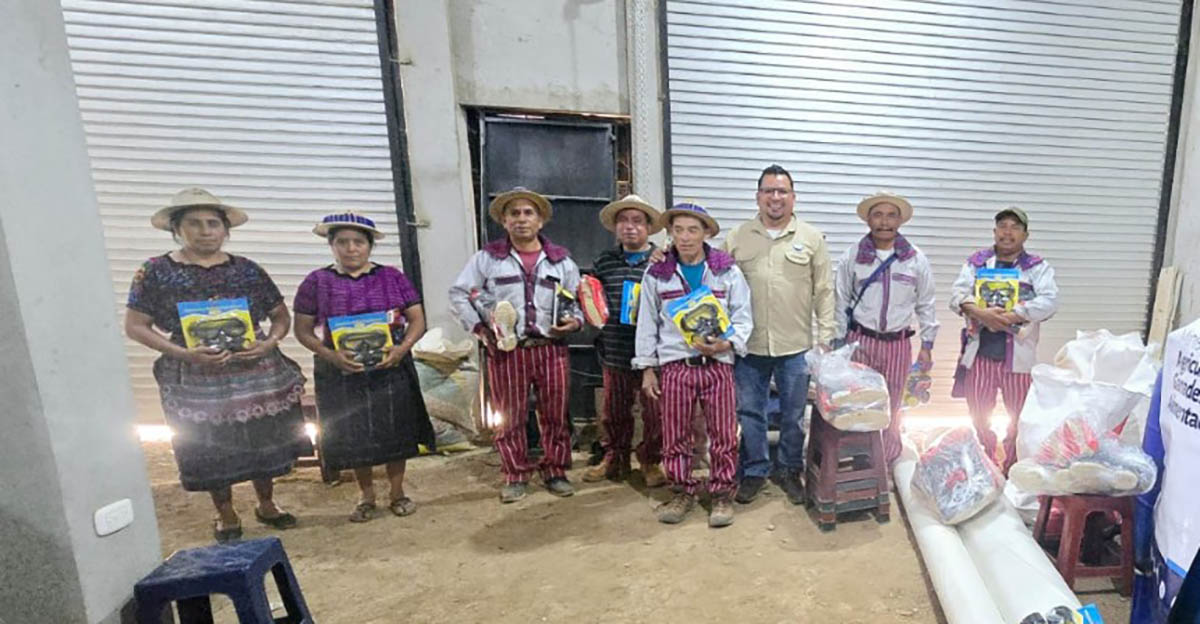 En este marco se realizó la entrega de botas de hule, respiradores, rollos de malla anti áfidos, rollos de nylon para invernadero y bolsas de polietileno a ocho productoras y productores de la Cooperativa Integral de Comercialización Flor de Mayo, de la aldea Mash, del municipio de Todos Santos Cuchumatán, Huehuetenango.