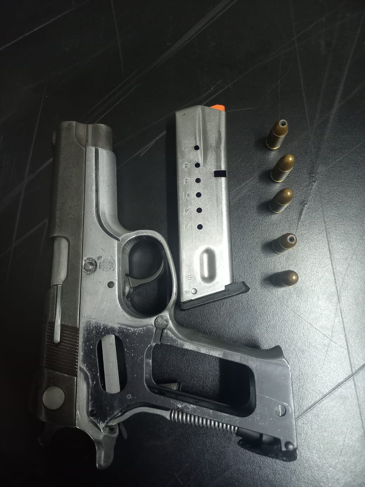 Las mandos policiales informaron que se les incautó un arma de fuego, marca Smith & Wesson, sin número de registro, una tolva, 5 cartuchos y 2 dispositivos móviles.