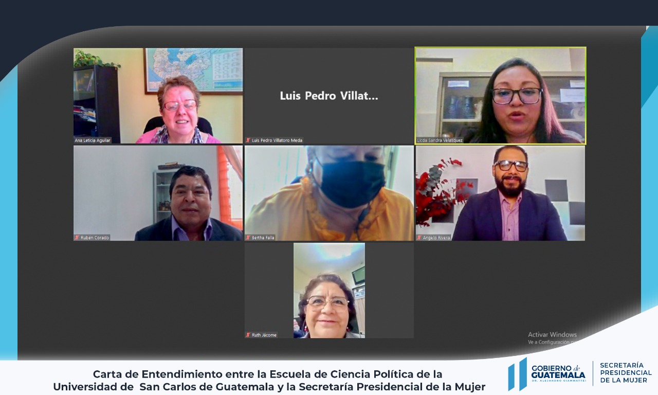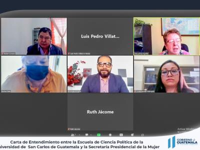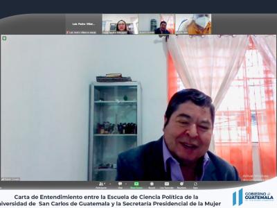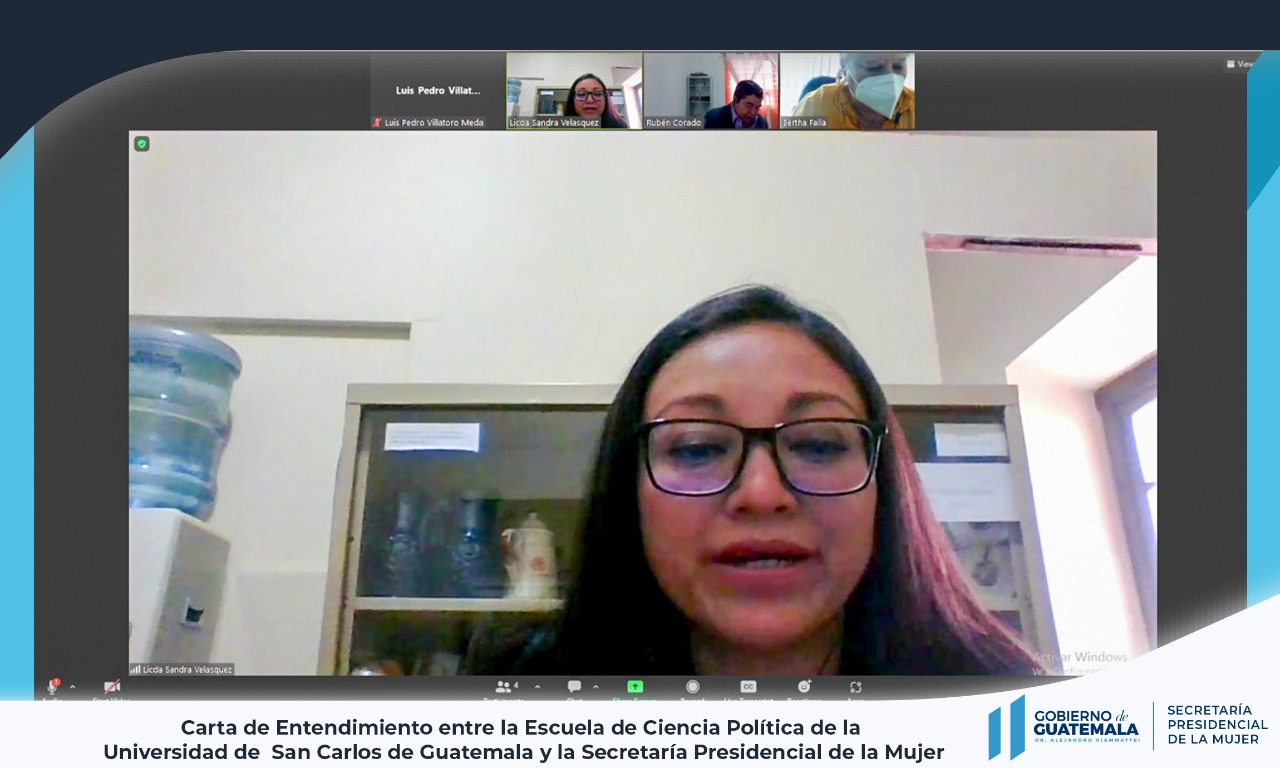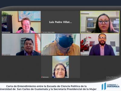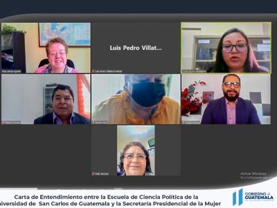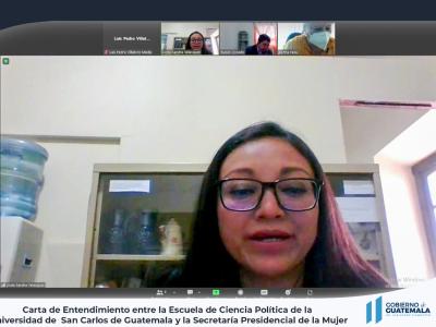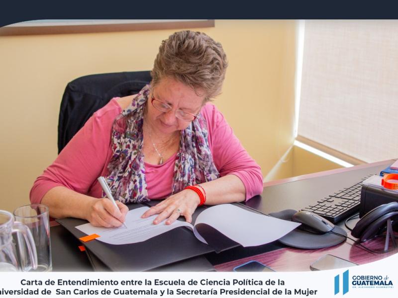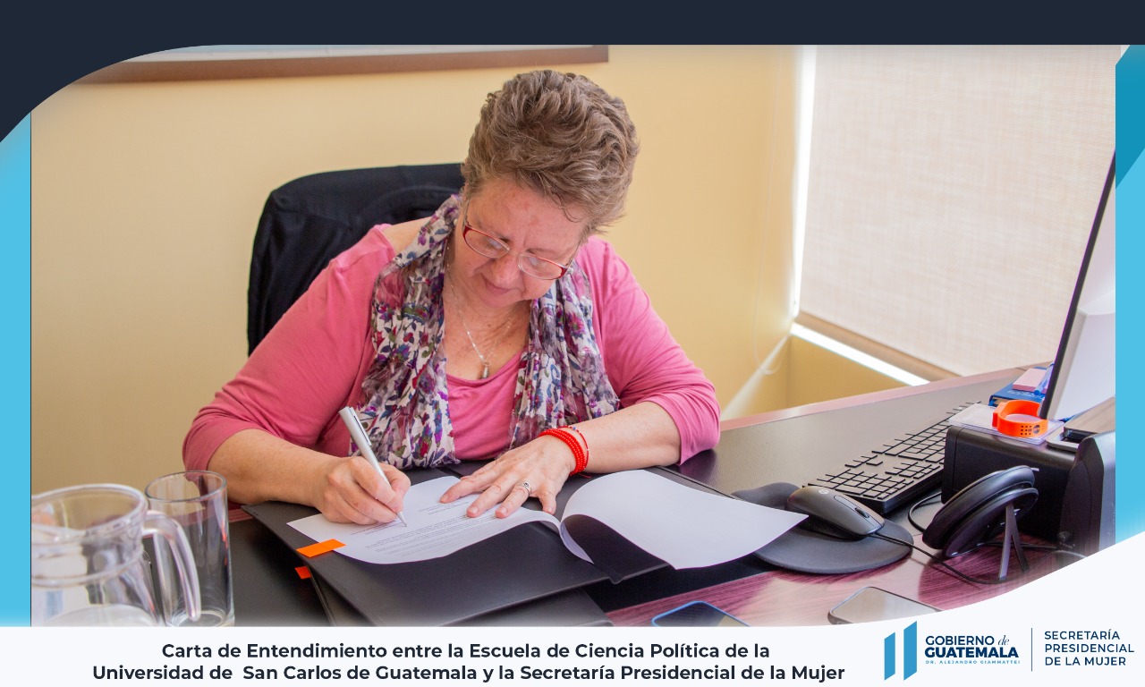 La Secretaría Presidencial de la Mujer y la Escuela de Ciencia Política de la Universidad de San Carlos de Guatemala, llevaron a cabo la suscripción de la Carta de Entendimiento y Cooperación, con el objeto de establecer las bases, para llevar a cabo actividades que impulsen acciones que promuevan articulaciones y debates académicos que permitan identificar rutas de acción a seguir en los diferentes campos de las ciencias sociales, como las Relaciones Internacionales, Sociología y Ciencia Política, para la incorporación del enfoque de equidad entre hombres y mujeres y derechos humanos de las mujeres en docencia, investigación y extensión universitaria de la Escuela.