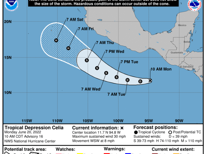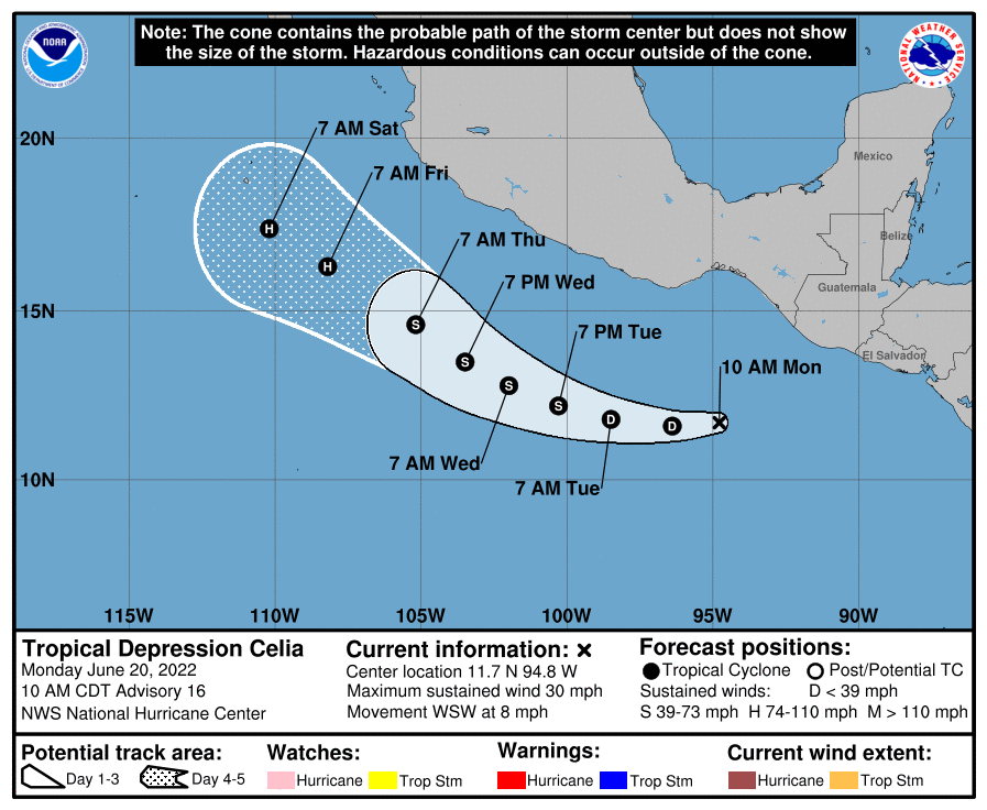 Se mantiene el monitoreo a la Depresión Tropical Celia, misma que se dirige al oeste-suroeste, alejándose así, del territorio guatemalteco, informó el Instituto Nacional de Sismología, Vulcanología, Meteorología e Hidrología -INSIVUMEH- en su Boletín Meteorológico Informativo No. 21-2022 a las 12:45 horas del lunes 20 de junio de 2022.
