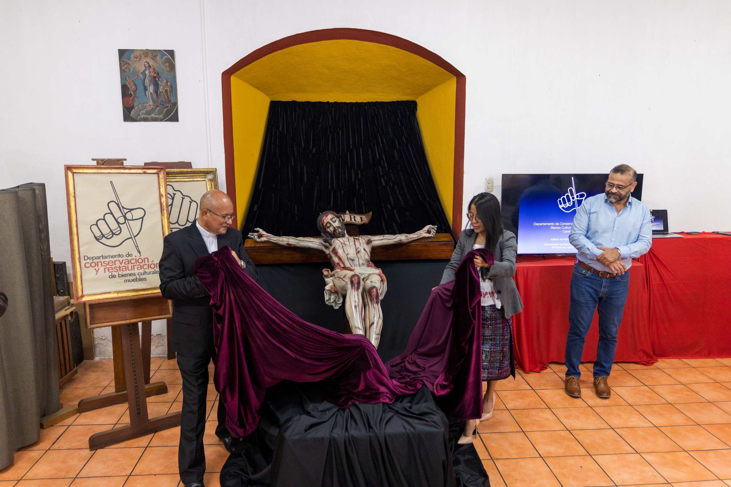 Tras varios meses de un arduo y detallado trabajo de restauración, el equipo técnico del Departamento de Conservación y Restauración de Bienes Culturales Muebles (CEREBIEM) del Ministerio de Cultura y Deportes (MCD) realizó la entrega oficial del Cristo Crucificado de la Catedral Metropolitana de Santiago de Guatemala. La imagen fue recibida por el párroco, José Luis Colmenares, en un acto que contó con la presencia de la viceministra de Patrimonio Cultural y Natural, Laura Cotí Lux.