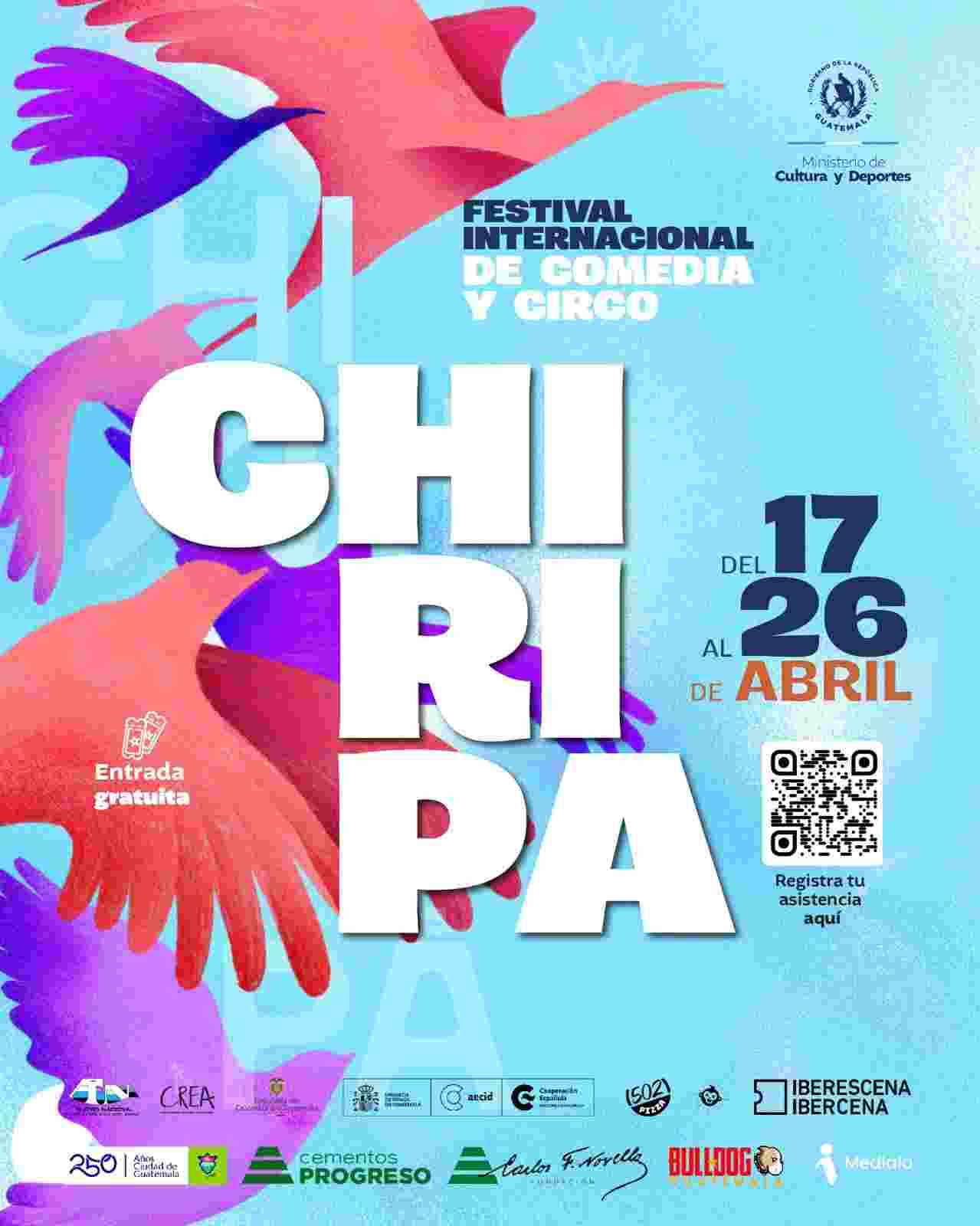 ¡Chiripa te espera en su sexta edición! El Festival Internacional de Comedia y Circo se llevará a cabo del 17 al 26 de abril en la ciudad de Guatemala, con actividades en el Centro Cultural “Miguel Ángel Asturias”, la Sexta Avenida, la Plaza Central y la Casa Ibargüen, así como una extensión comunitaria en la zona 6 y Chinautla.