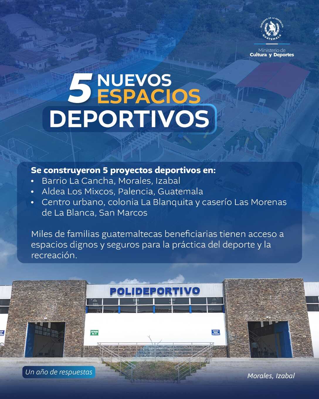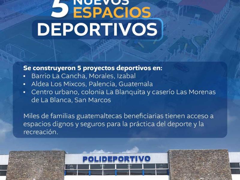 En 2025, el Ministerio de Cultura y Derpotes impulsó la construcción de 5 nuevos espacios deportivos en diversos puntos de el país. Miles de guatemaltecos cuentas con espacios seguros y gratuitos para la sana recreación.